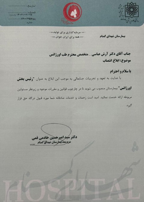 انتصاب آقای دکتر آرش عباسی با عنوان معاون درمان و رئیس بخش اورژانس بیمارستان شهداء گمنام