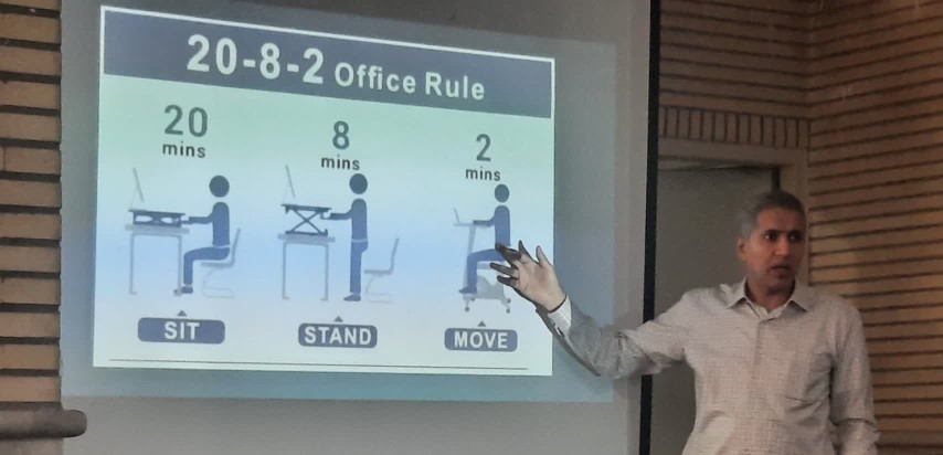 دراین کارگاه یک روزه مهندس ابوذر عینی‌پور، کارشناس بهداشت حرفه‌ای معاونت بهداشت دانشگاه علوم پزشکی شهید بهشتی و مدرس این کارگاه ، به بیان اصول ارگونومیک در محیط کار از جمله نحوه صحیح نشستن و طراحی مناسب صندلی پرداختند و به پرسش‌های شرکت‌کنندگان پاسخ دادند.